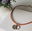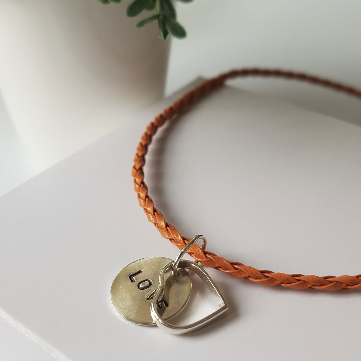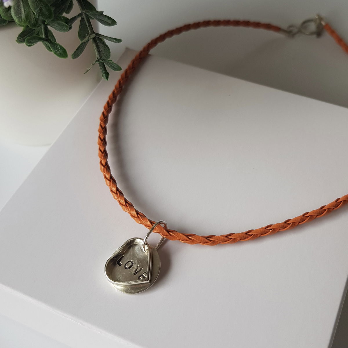 Con dije doble (corazón y medallita cincelada) hecho a mano en plata 925 y collar de cuerina en color naranja/ladrillo.