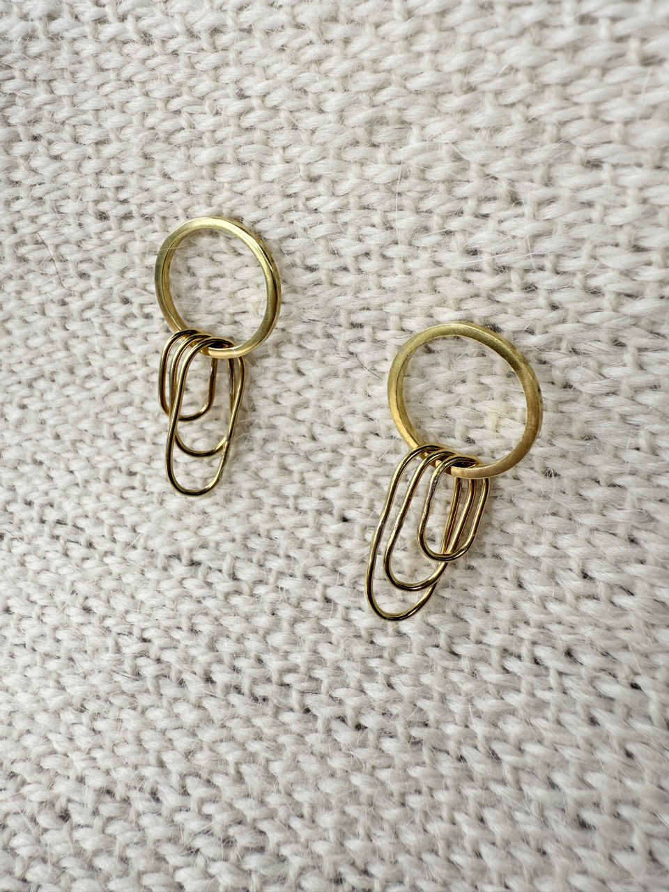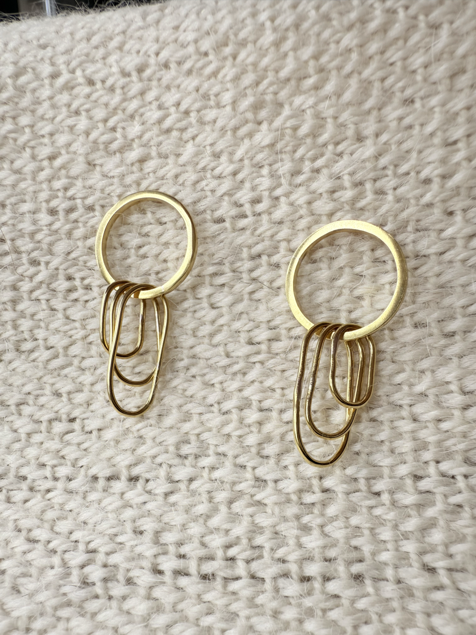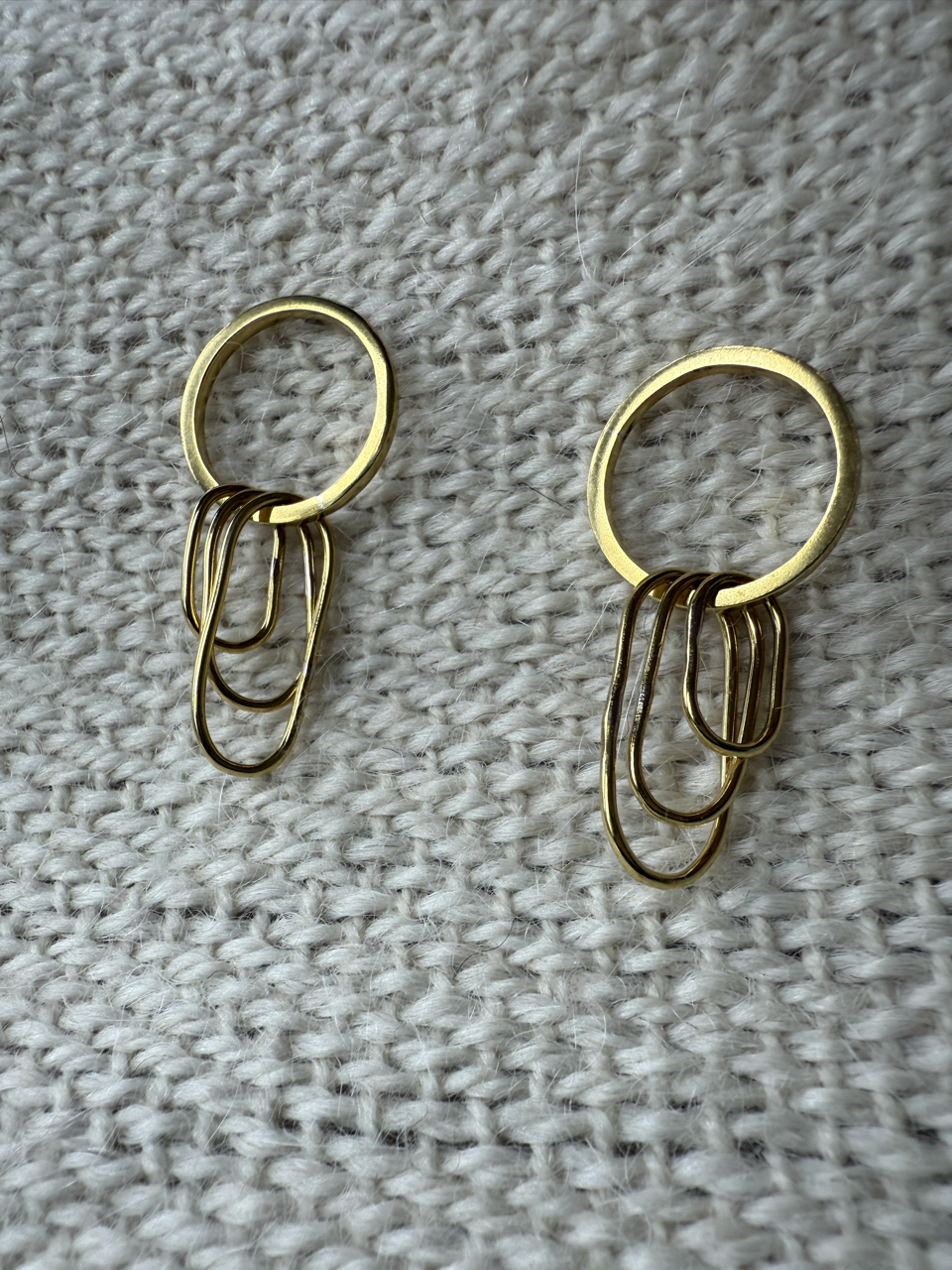 Aros hechos en bronce, base en forma de círculo y eslabones colgantes en tres tamaños.