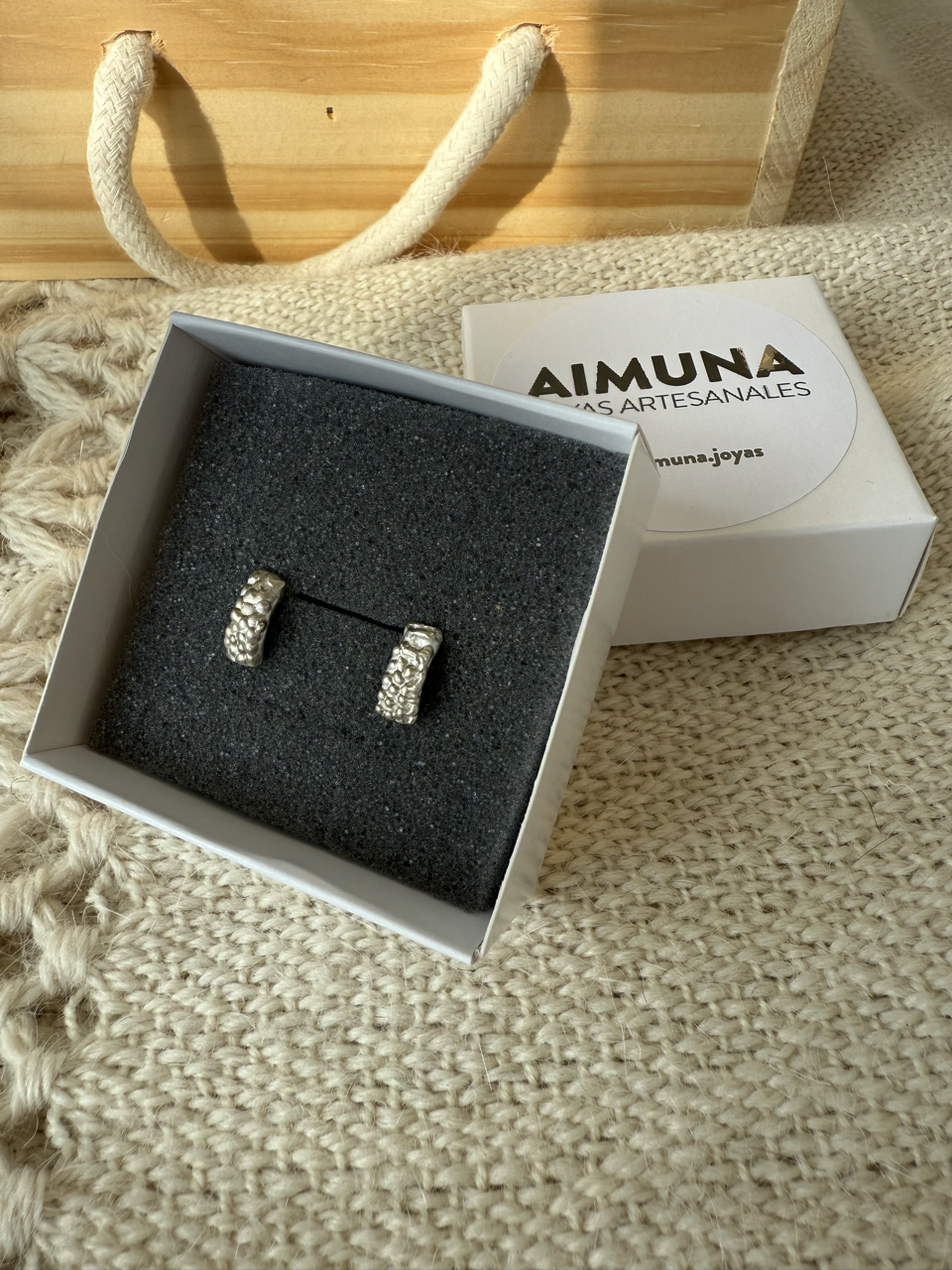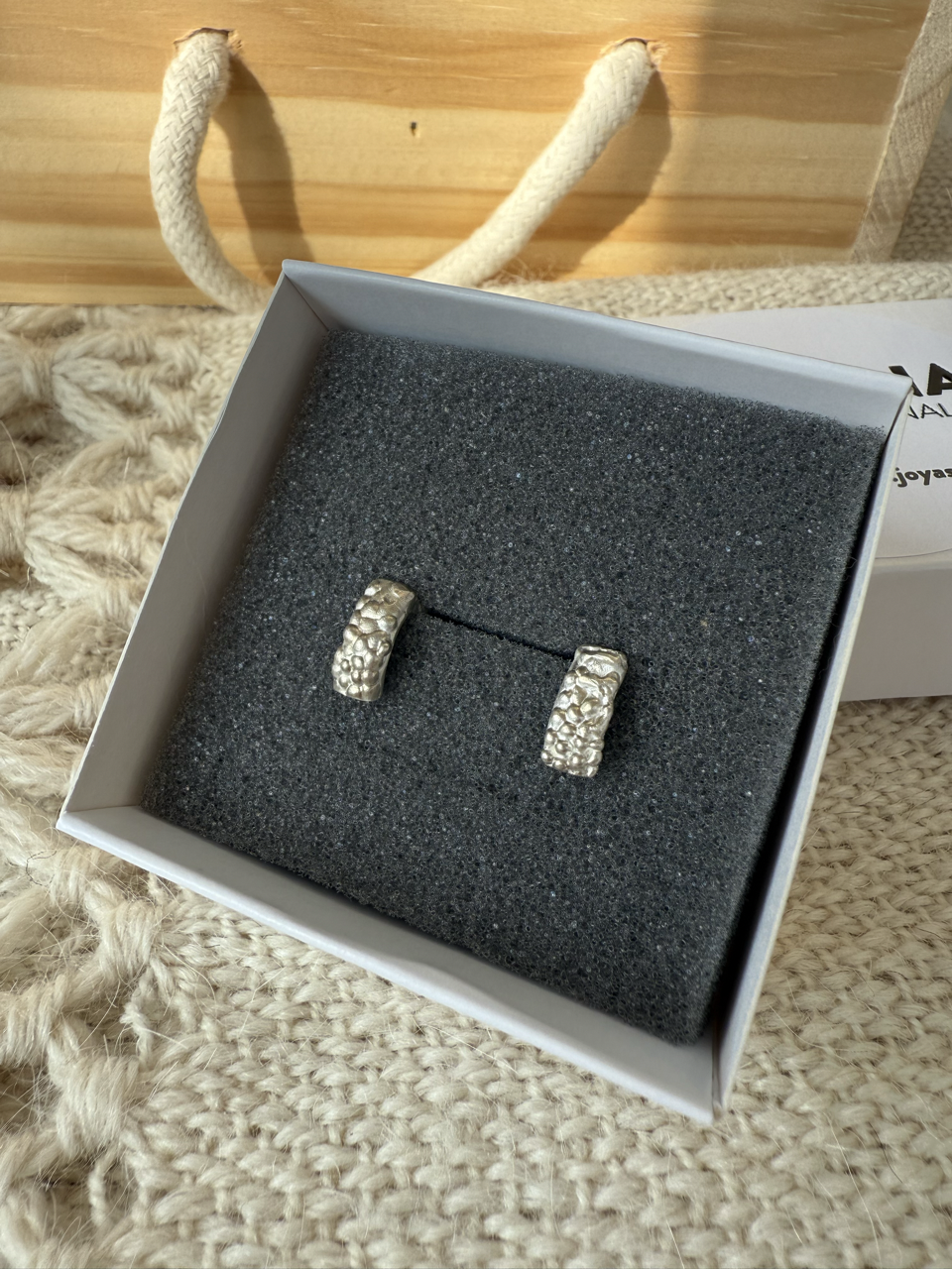 Aros tallados en cera y fundidos en plata 925, con terminación satinada. Con perno.