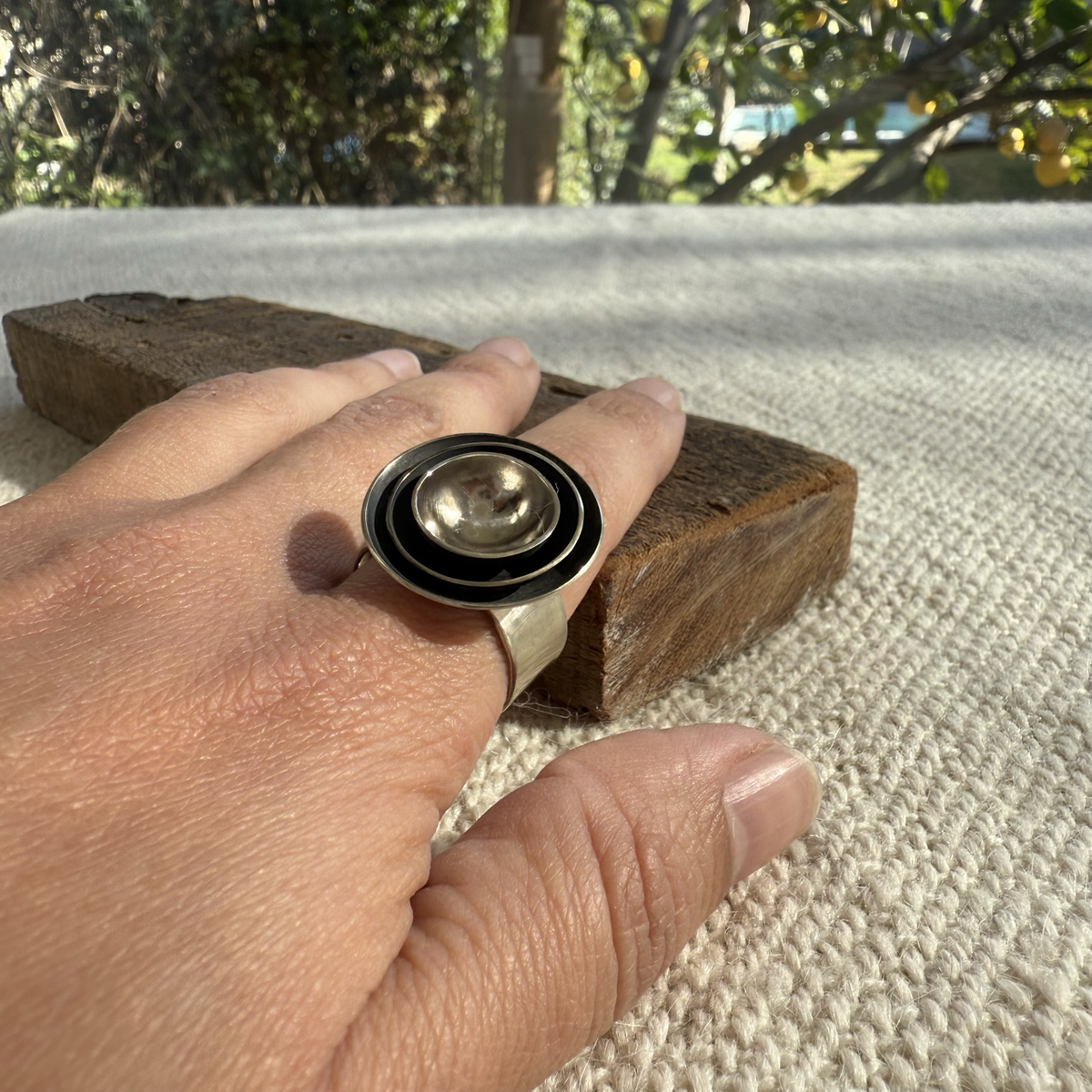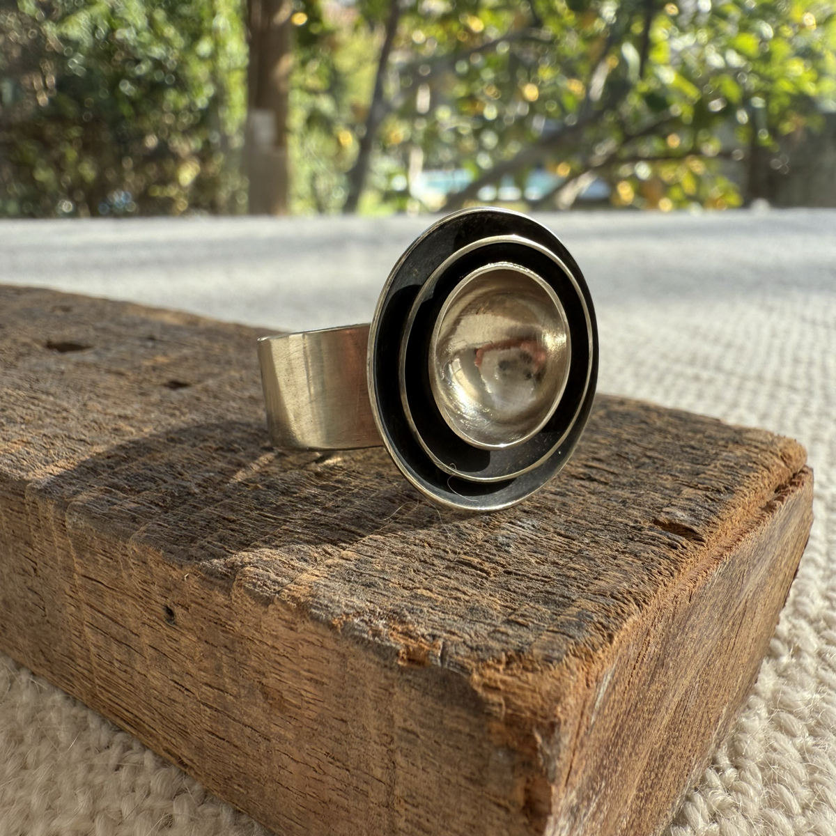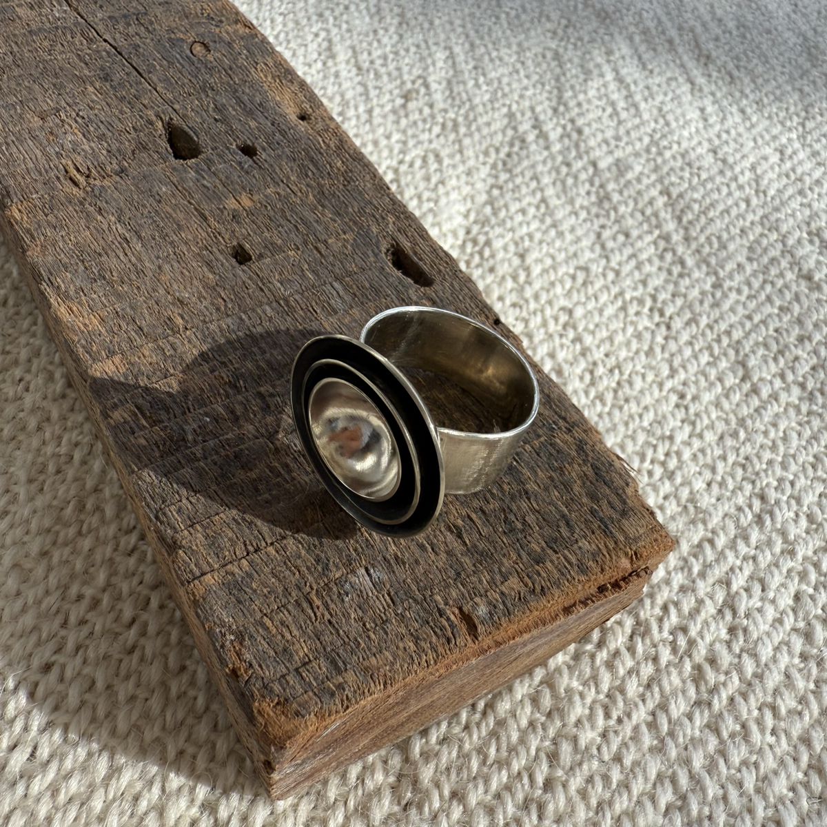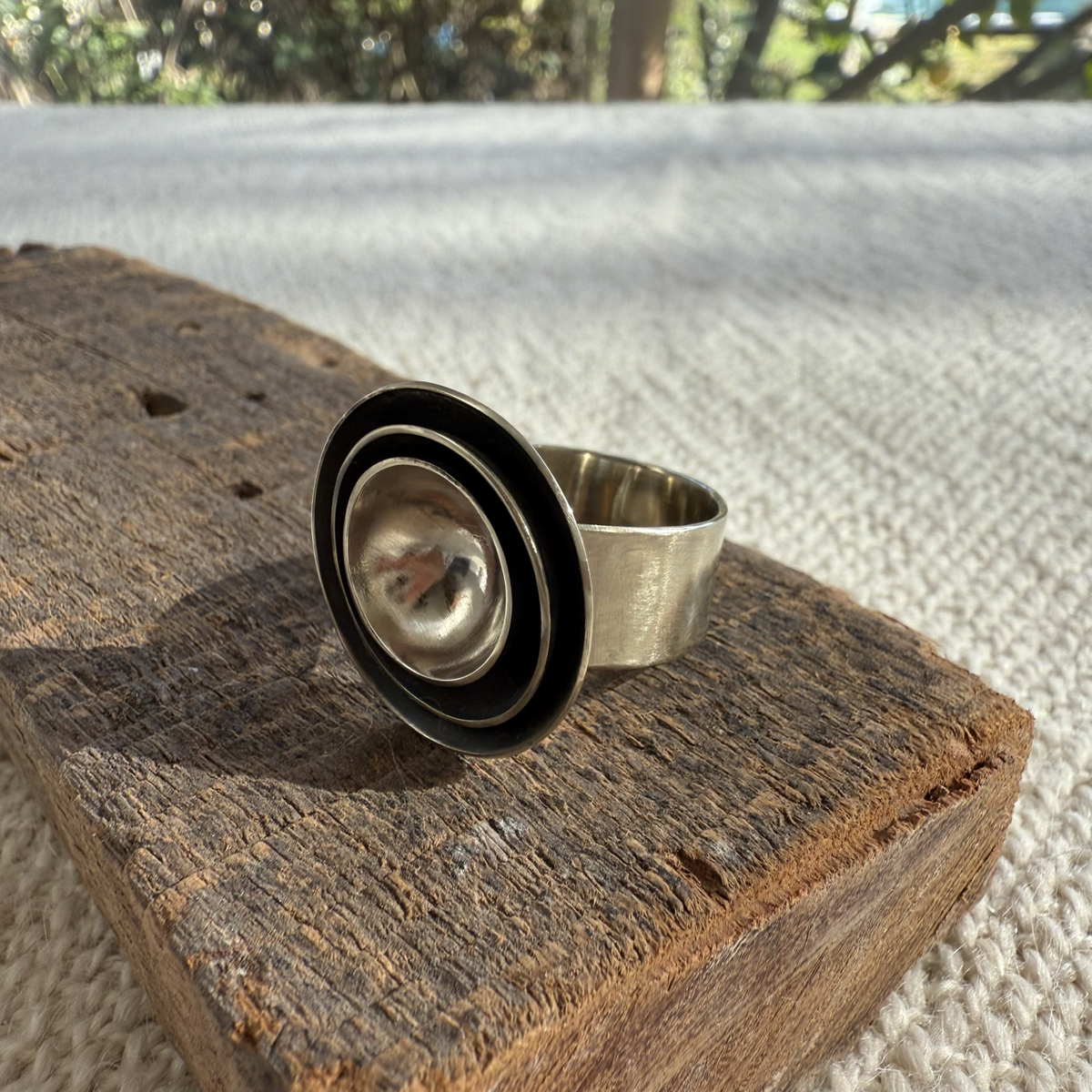 Anillo de alpaca, con cuencos patinados.